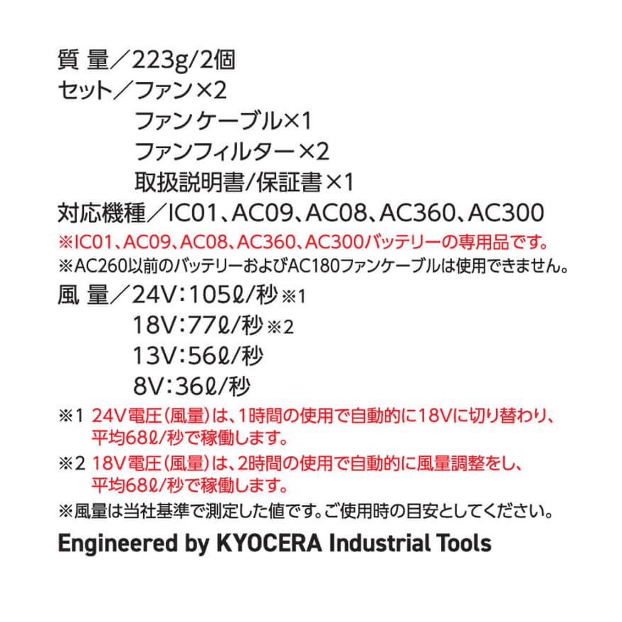 ・セット:リチウムイオンバッテリー×1 充電器×1 ファン×2 ファンケーブル×1 ファンフィルター×2 取扱説明書/保証書×1
