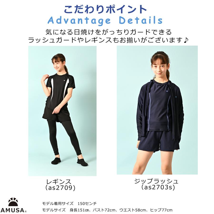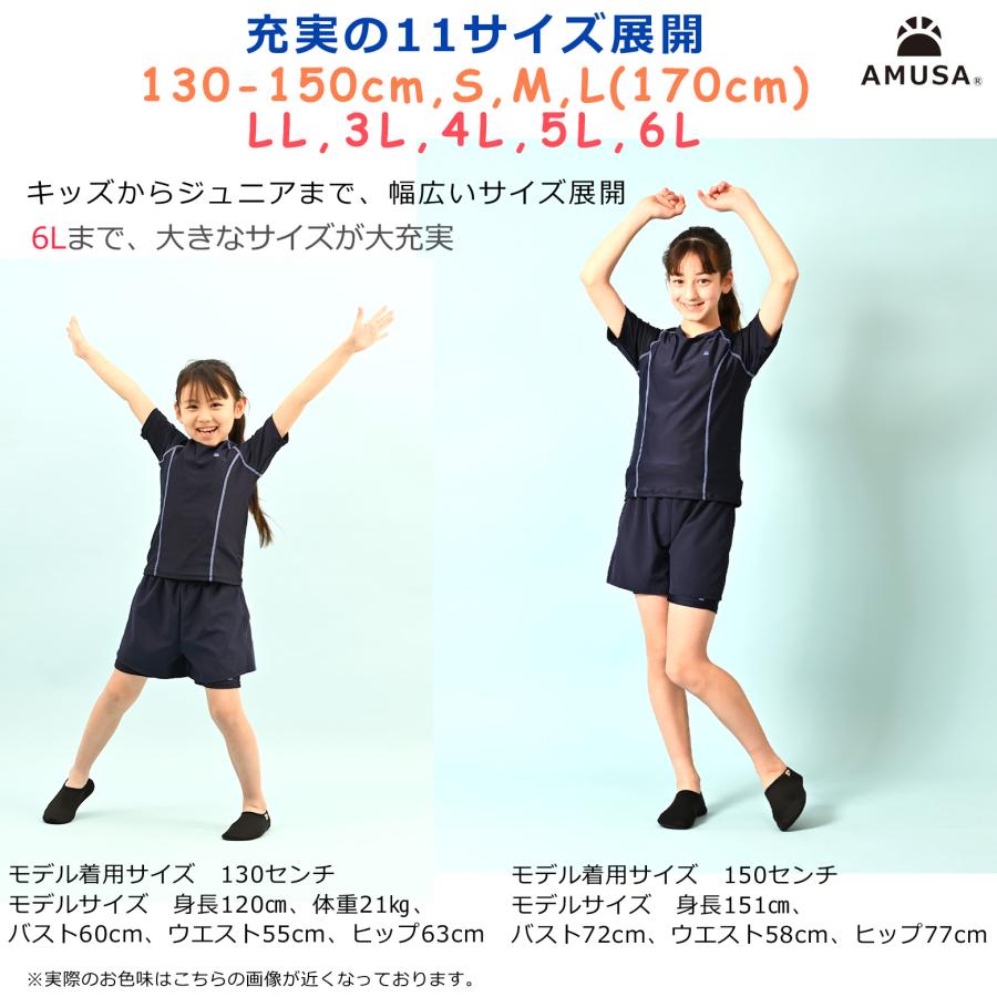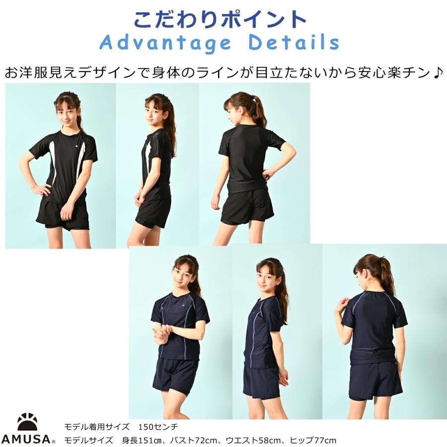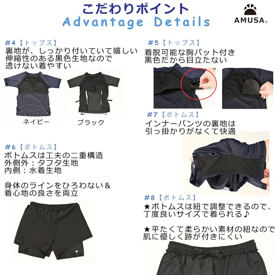 高品質高機能セパレート型水陸両用女子スクール水着です。スポーティなお洋服見えデザインなので、水陸両用でご利用いただけます。ボトムスは、スパッツの上にカバーパンツがついているので、身体のラインが目立たないオシャレな工夫で、安心&ラクチン。洗練されたスタイルでワンランク上のスクール水着です。カラーはブラックとネイビーの2種類。トップスは伸縮性のある黒色生地の裏地がついているので、透けなくて着やすいです。着脱可能な胸パットもついています。脇にホックがあるので、水中でめくれ上がる心配がありません。素材にも拘っており、高機能素材を採用。日本の代表的な検査機関で試験・合格した機能素材を使っております。1.UPF+50 紫外線遮蔽率の格付けでは最高値です。2.抗菌防臭 繊維上の最近の増殖を防止し、気になるニオイを抑えます。3.塩素堅牢度 プール水等の消毒に用いられる塩素による変退色試験に高いレベルで合格しました。サイズは130cm〜150cmサイズ、Sサイズ〜6Lサイズがあります。