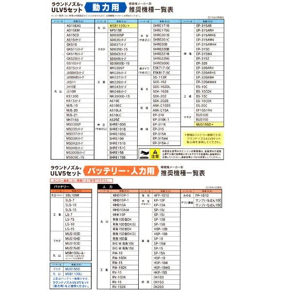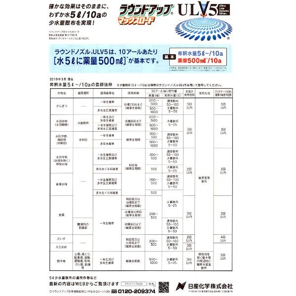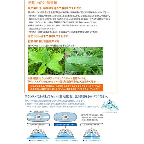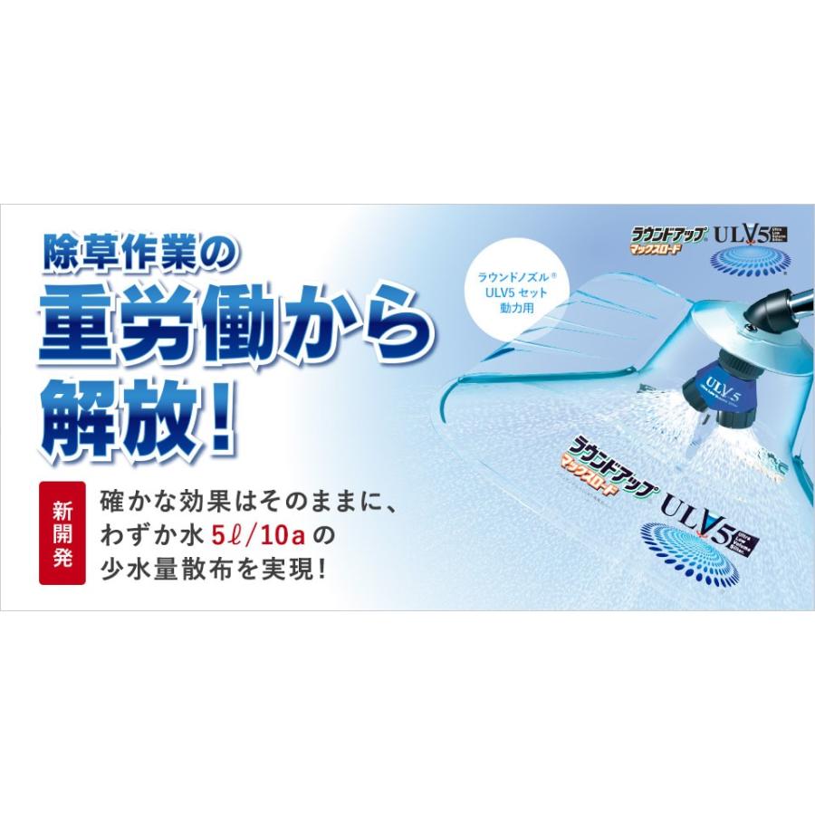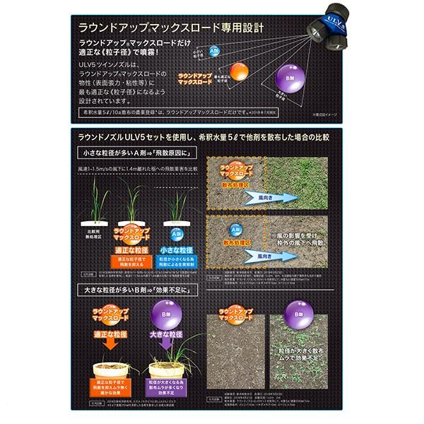 ラウンドノズルULV5セットは除草剤ラウンドアップマックスロード専用設計で新しく開発されました。ULV5テクノロジーにより、ラウンドアップマックスロードの確かな除草効果はそのままに、わずか水5L/10aの少水量散布を実現。今までと同じ面積を散布する場合には、背負う水量が圧倒的に軽く非常に“楽に”散布ができます。<br>また、今までと同じ水量を給水する場合には、一度の給水でより広い面積に散布でき、除草作業の大幅な省力化が可能です。