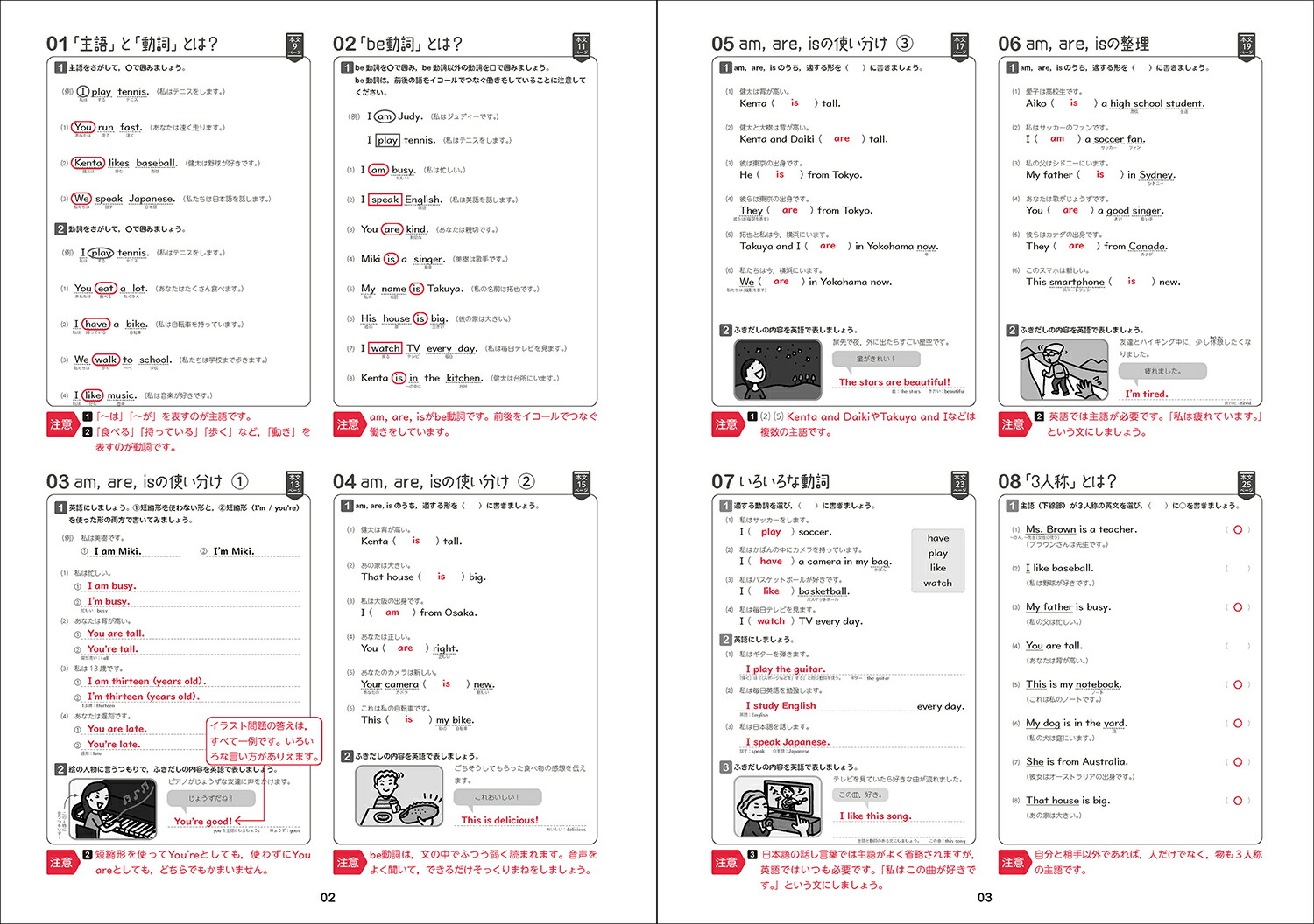 「中学英語の一番わかりやすい本ってどれ? 」「英語ってどう勉強したらいいんだろう? 」そんな声にこたえた中学生のための個人授業(こじんじゅぎょう)『ひとつひとつわかりやすく。』シリーズ中学英語を超基礎レベルからやさしく解説。少しずつ、効率よく学べるようにわかりやすい解説(左ページ)+書き込み式の練習問題(右ページ)が見開きで勉強できる。参考書としても問題集としても使える。中学生の予習・復習はもちろん、高校生の復習や大人の学び直しにも大活躍。単語、文法、リスニングもこれ1冊。中学英語の改訂のポイント●オールカラー化で、図解やイラストがもっとみやすく、もっとわかりやすく。●学習管理シールつき。手帳やカレンダーに貼って、計画的に進められます。●MUD(メディア・ユニバーサル・デザイン)認証取得。誰もが読みやすい文字と色づかいにこだわりました。●別冊解答は問題ページのレイアウトそのまま、解答を入れた再録式! ラクラク答え合わせできます。●音声アプリ対応。スマホでリスニング練習できます。*~*~読者の声~*~*わかりやすく、とりかかりやすい(中1)絵がたくさん入っていていい(中1)重要なところを簡潔にまとめてあるので、要点がすぐ分かる(中1)英文の作り方について、子どもがちゃんと理解できるように説明してある(保護者)わからなかったところが、わかるようになった! (中1)中学英語のおすすめポイント●超基礎からやさしく難しい用語なし! わかりやすい文章とイラストで解説。1回分はたったの2ページ。ムリなくサクサク進みます。●英語力の土台をつくる反復練習やさしい練習問題をたくさん解いて、しっかり定着。定期テストの実戦力だけでなく、英語で文を組み立てる力も自然に身につきます。●高校生の復習や、大人の学び直しにも! 英語は、積み重ねが大切な教科です。「動詞の形の使い分け」「Do you ~? とAre you ~? の整理」など、英語のもっとも基礎となる内容の総点検・苦手克服にも最適です。高校英語の前の確認にも!