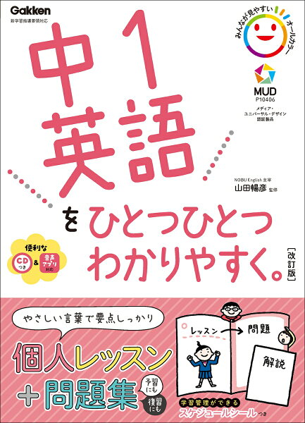「中学英語の一番わかりやすい本ってどれ? 」「英語ってどう勉強したらいいんだろう? 」そんな声にこたえた中学生のための個人授業(こじんじゅぎょう)『ひとつひとつわかりやすく。』シリーズ中学英語を超基礎レベルからやさしく解説。少しずつ、効率よく学べるようにわかりやすい解説(左ページ)+書き込み式の練習問題(右ページ)が見開きで勉強できる。参考書としても問題集としても使える。中学生の予習・復習はもちろん、高校生の復習や大人の学び直しにも大活躍。単語、文法、リスニングもこれ1冊。中学英語の改訂のポイント●オールカラー化で、図解やイラストがもっとみやすく、もっとわかりやすく。●学習管理シールつき。手帳やカレンダーに貼って、計画的に進められます。●MUD(メディア・ユニバーサル・デザイン)認証取得。誰もが読みやすい文字と色づかいにこだわりました。●別冊解答は問題ページのレイアウトそのまま、解答を入れた再録式! ラクラク答え合わせできます。●音声アプリ対応。スマホでリスニング練習できます。*~*~読者の声~*~*わかりやすく、とりかかりやすい(中1)絵がたくさん入っていていい(中1)重要なところを簡潔にまとめてあるので、要点がすぐ分かる(中1)英文の作り方について、子どもがちゃんと理解できるように説明してある(保護者)わからなかったところが、わかるようになった! (中1)中学英語のおすすめポイント●超基礎からやさしく難しい用語なし! わかりやすい文章とイラストで解説。1回分はたったの2ページ。ムリなくサクサク進みます。●英語力の土台をつくる反復練習やさしい練習問題をたくさん解いて、しっかり定着。定期テストの実戦力だけでなく、英語で文を組み立てる力も自然に身につきます。●高校生の復習や、大人の学び直しにも! 英語は、積み重ねが大切な教科です。「動詞の形の使い分け」「Do you ~? とAre you ~? の整理」など、英語のもっとも基礎となる内容の総点検・苦手克服にも最適です。高校英語の前の確認にも!「中学ひとつひとつわかりやすく」シリーズの特徴要点をしぼった解説・練習問題だからわかる!1回分は約15分。解説は難しい言葉をなるべく使わず、イラストを使っているのが特徴です。簡単に感じられるレベルから練習問題をひとつひとつ解き進めることで、無理なく学習内容を身につけられます。MUD認証取得・みんなが見やすいオールカラーMUDとは、情報が、一般の人はもちろん、高齢者・色覚障がい者などにも、伝わりやすくするための配慮手法です。文字の大きさや色づかいに配慮をし、だれもが見やすいオールカラー紙面になりました。新指導要領対応。英語はスマホで発音が確認できる!中学英語では、「聞く」「読む」「書く」「話す」力をバランスよく伸ばすことが求められます。当シリーズは、音声CDつき・音声アプリ対応なので、正しい発音を確認しながら、英語を学習することができます。お客様の声をもとに、リニューアル!見たまま直感的に答え合わせできる「再録式」解答解説の見やすさ・わかりやすさを求める声に応えて、解答解説は並べて答え合わせしやすい「再録式」を採用しました(国語を除く)。スケジュールシールで学習習慣作りもサポート毎回の学習が終わるたびに、目次にシールを貼ることで、進み具合がひとめでわかります。また、自分の手帳やカレンダーにシールを貼ったりすることで、計画的な学習習慣も身につきます。表紙はシンプルで持ち歩きやすいデザイン持ち歩いて使いたいという声に応えて、カバーを外すとさらにシンプルなデザインで使えるように仕上げました。カラフルなデザインで楽しく使えます。更新日:2025年08月08日
