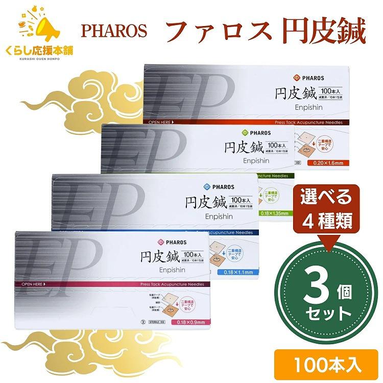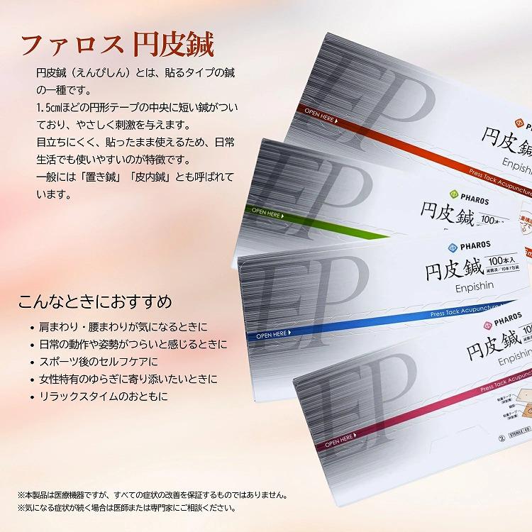 【選べる3個セット】 ファロス 円皮鍼 えんぴしん 100本入 円皮針 ステンレス銅線材 医家向け 管理医療機器 PHAROS ファロス円皮鍼 二重構造 施術 肌にやさしいサージカルテープ 絆創膏 鍼灸 送料無料 テープで鍼を挟み込む二重構造となっているため、鍼に安定感があり、施術点にピンポイントに刺しやすいです。また鍼の抜け落ち等のリスクも大幅に低減出来るので安心安全です。