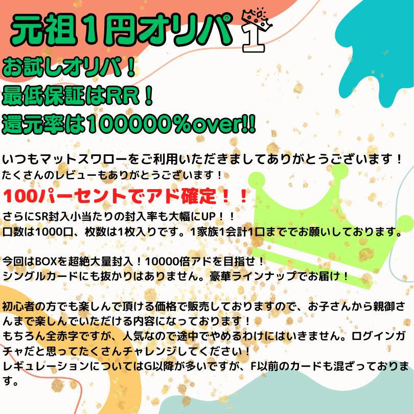 ※他の1円オリパと同時購入は不可です。他の1円オリパやサービス品(200円オリパなど)と同時注文した場合は送料をいただく設定となってます。