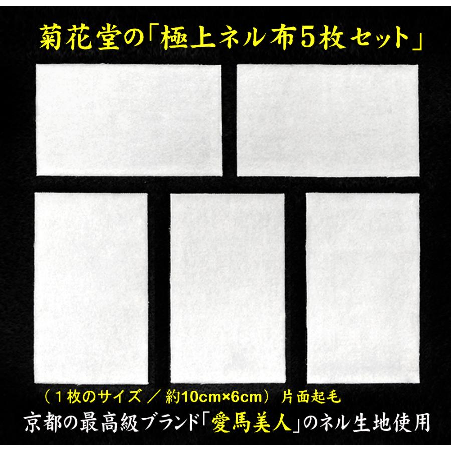 『ブランド極上ネル布5枚セット』のご紹介<br /> 京都の最高級ブランド『愛馬美人』のネル生地を、使い易いサイズにカットしてございます。<br />菊花堂の『御宝刀用精油』に最適な布地を求めて、様々なネル布で塗り試しの結果、この京都の『愛馬美人』が一番油の馴染み具合や塗り心地が良く、又、裏面の織り地が塗布時の『指の滑り止め効果』を発揮致しますので、安全にご使用頂けます。<br /> 1枚( 約10 cm × 6 cm )の 5枚セット・360円(送料無料)<br />この商品は、『日光東照宮 宝物館』様を始め、『日本美術刀剣保存協会の刀剣博物館』様や、『全国の有名美術館』様などでもご使用頂いております。<br /> 刀剣油研究処 菊花堂(昭和58年創業)<br /><br />【ゆうパケット配送キャンペーンのお知らせ】<br /> この度弊店では『2個以上』ご注文のお客様には『ゆうパケットにて土日祝も迅速配送キャンペーン』を実施致します。