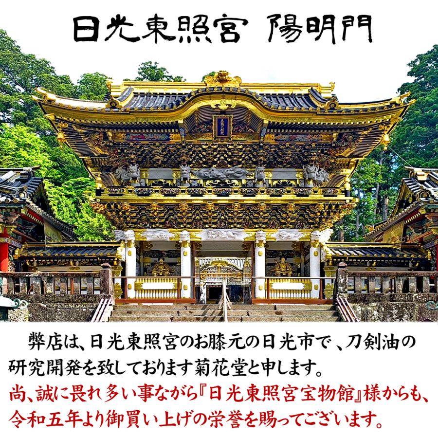 特長は、サラリとした無色透明の最極上精油で、極少量でも驚くほど伸びて、今迄に無い超極薄の強靭な防錆油膜を形成致しますので、塗ったままでも鑑賞や鑑定が可能です。従って、展示用刀剣にも最適です。
