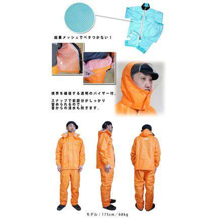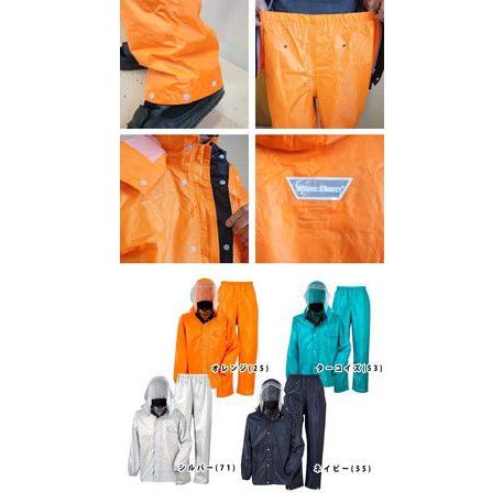 メーカー名:カジメイク品番:ディフェンドレインスーツ #3293素材:表地:ポリエステル100%(PVCラミネート)内衿・前立て裏:ナイロン100%裏地:ポリエステル100%(メッシュ)耐水圧:10,000mmサイズ:S・M・L・LL・3L・4Lカラー:ネイビー(55)・シルバー(71)・ターコイズ(53)・オレンジ(25)