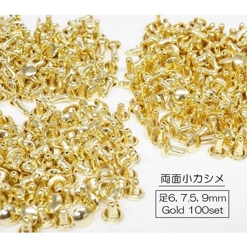 ※お写真より薄い色目(ホワイトゴールド寄り)となっております。〇素材 鉄 〇カラー ゴールド(本金メッキ)〇サイズ 頭6mm 足6mm, 7.5mm, 9mm(頭の頂点から足の先端までの長さ)(※実際の足のみの長さは、それぞれ約-1mmほどです)〇個数 100個入り日本製、ゴールド色(本金メッキ)の両面小カシメです。お得な100組入りです。足の長さ6mm, 7.5mm, 9mmからお選びいただけます。レザークラフト、ハンドメイド材料にぜひお使い下さいませ。