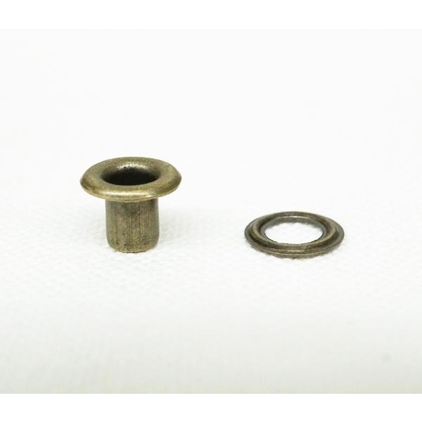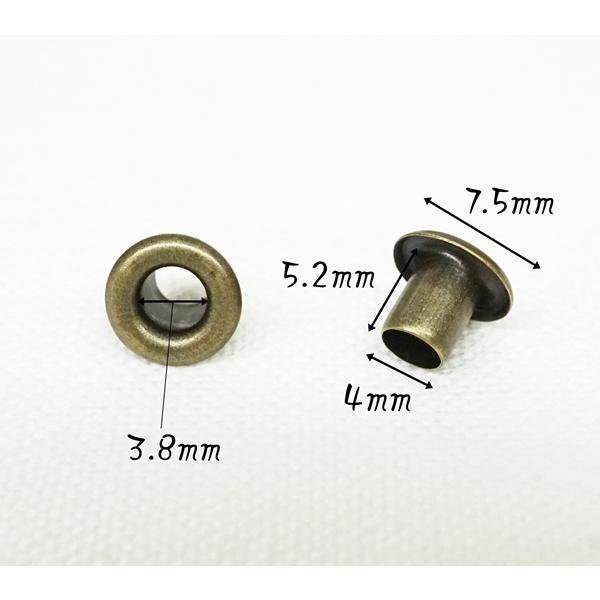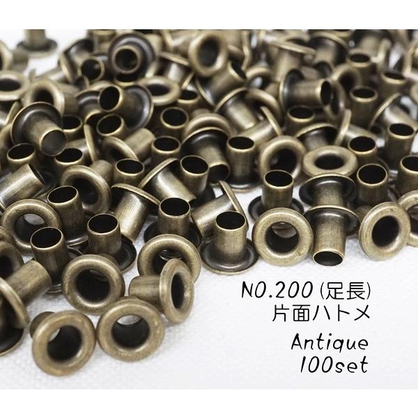 〇素材 真鍮〇カラー アンティーク(AG)〇サイズ 内径3.8mm 外径7.5mm 足5.2×4mm (写真を参照)〇個数 100個(座金付)日本製のNO.200番の片面ハトメ、足長サイズです。お得な100個セットです。小物などレザークラフト、ハンドメイドにぜひお使い下さいませ。※片面NO.200番(丸潰)の打ち具が必要になります。ご確認の上、お買い求め下さいませ。
