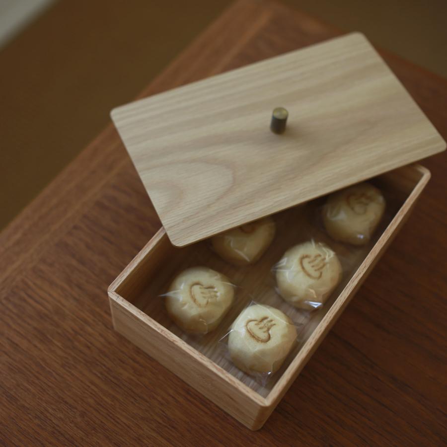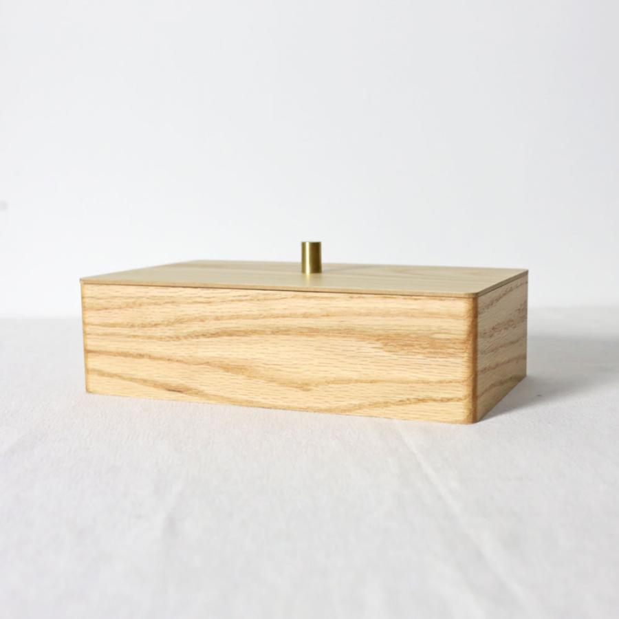 オークの無垢材で作ったアメニティボックスです。リクエストの多い衛生面に配慮した蓋付き仕様で、オリジナルの真鍮無垢の削り出しツマミを使用。四隅を丸く削り出し(角R)たことにより空間になじむやさしいたたずまいも魅力です。洗面所のアメニティ入れや、お茶菓子入れなどとしてお使いいただけます。