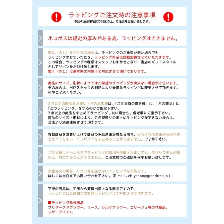 ・商品のサイズ、形状によってはご希望のラッピングが出来ない場合がございます。その場合は、当店スタッフの判断により最適なラッピングに変更させて頂きますのでご了承ください。
