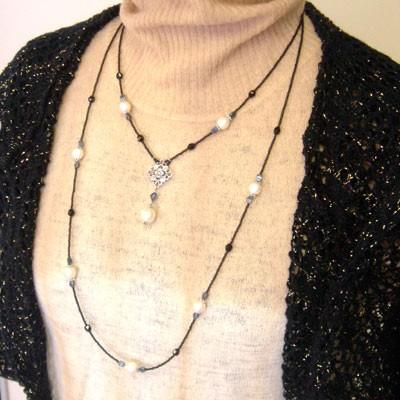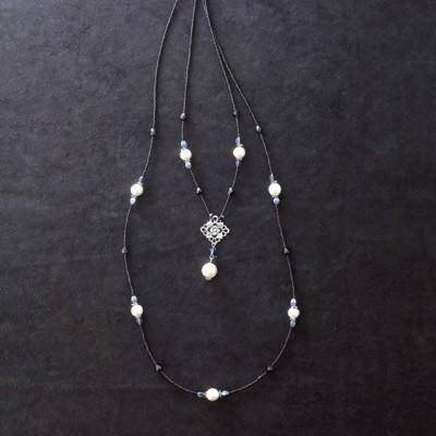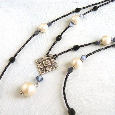 優しい輝きのコットンパールをバランス良く配置して黒系のビーズでまとめると、シックで使えるアイテムになりました。
