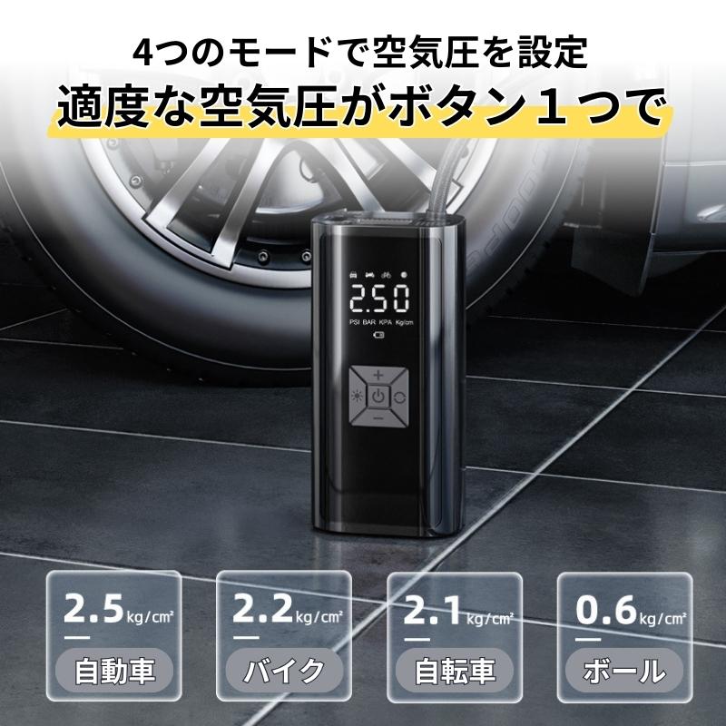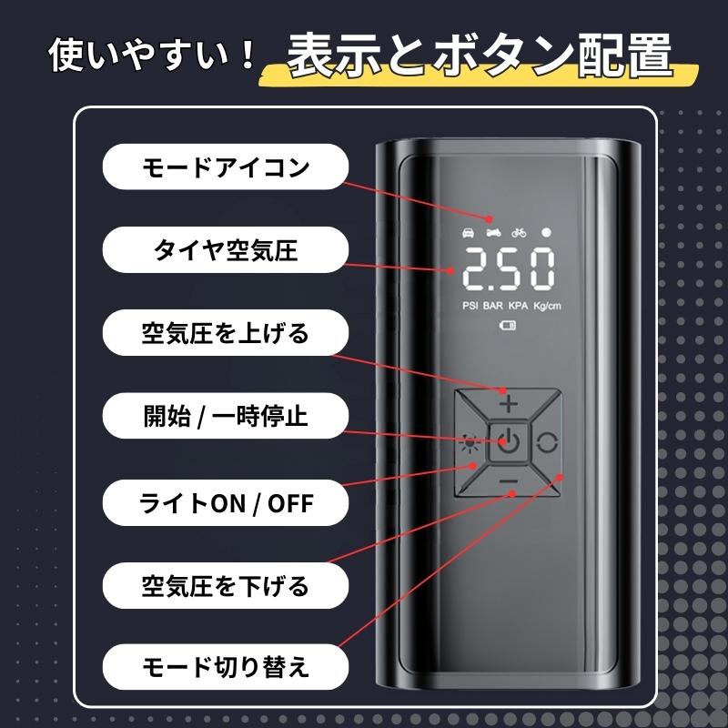 ・商品名:電動 空気入れ 自動車 エアーポンプ 充電式 車 バイク 自転車 ボール タイヤ 浮き輪 USB コンプレッサー 軽量 小型 事故 防止 防災 懐中電灯