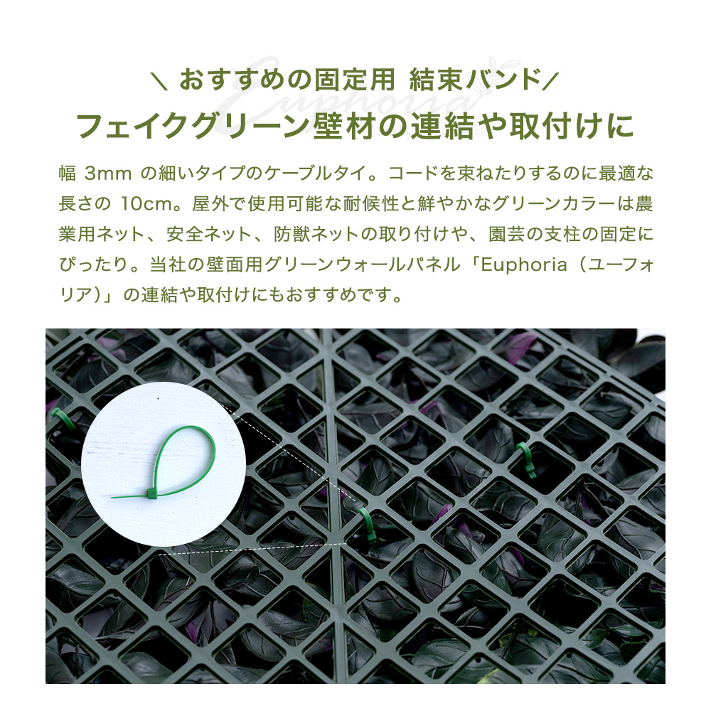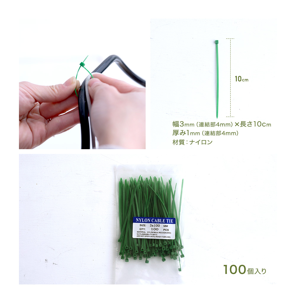 1袋100個入り幅3mmの細いタイプのケーブルタイ。コードを束ねたりするのに最適な長さの10cm。屋外で使用可能な耐候性と鮮やかなグリーンカラーは農業用ネット、安全ネット、防獣ネットの取り付けや、園芸の支柱の固定にぴったり。当社の壁面用グリーンウォールパネル「Euphoria(ユーフォリア)」の連結や取付けにもおすすめです。【サイズ】幅3mm(連結部4mm)×長さ10cm厚み1mm(連結部4mm)【重量】25g/袋【材質】ナイロン※クロネコゆうパケット9個まで可