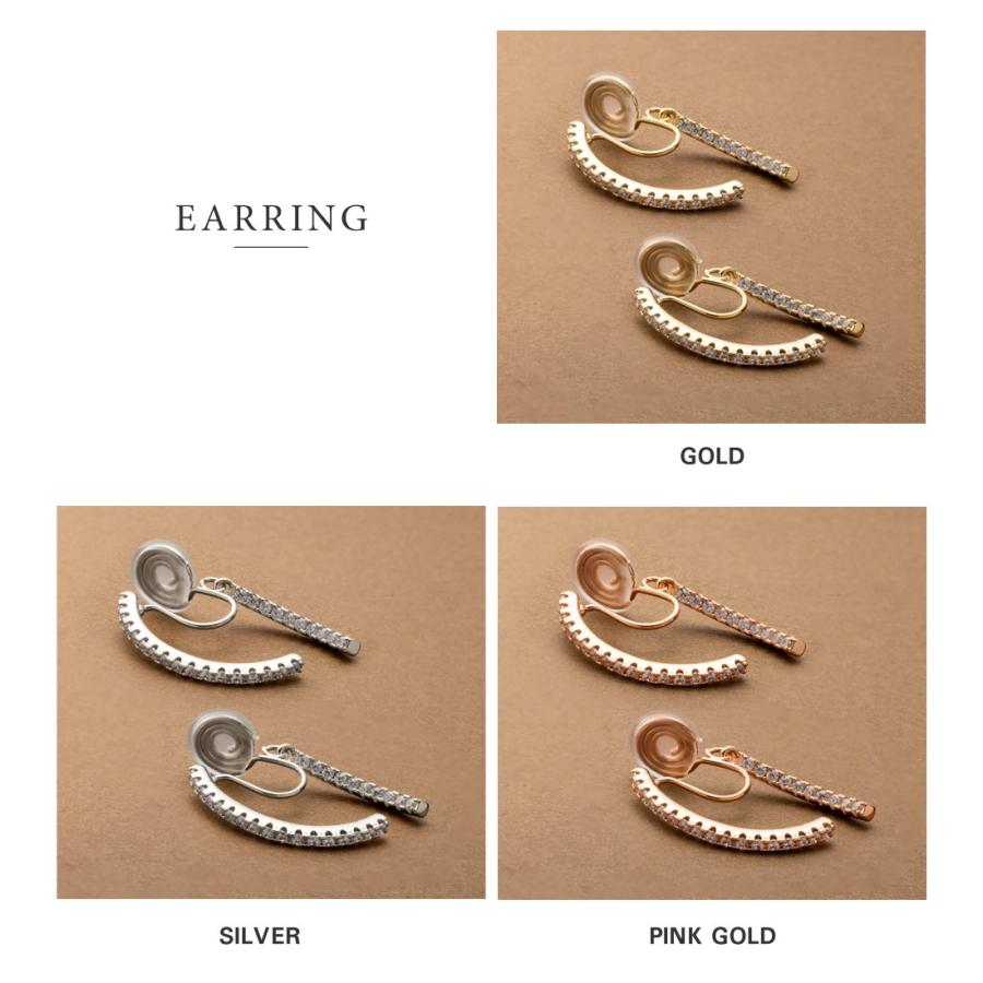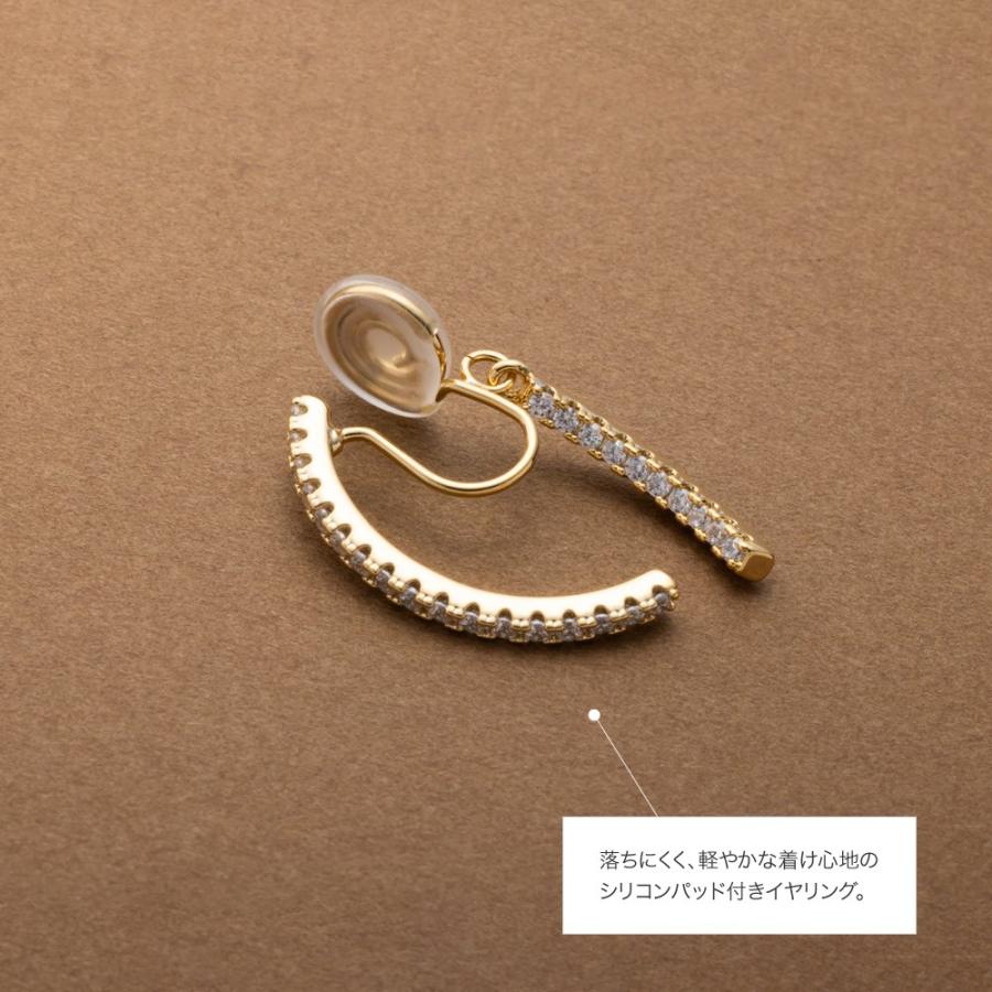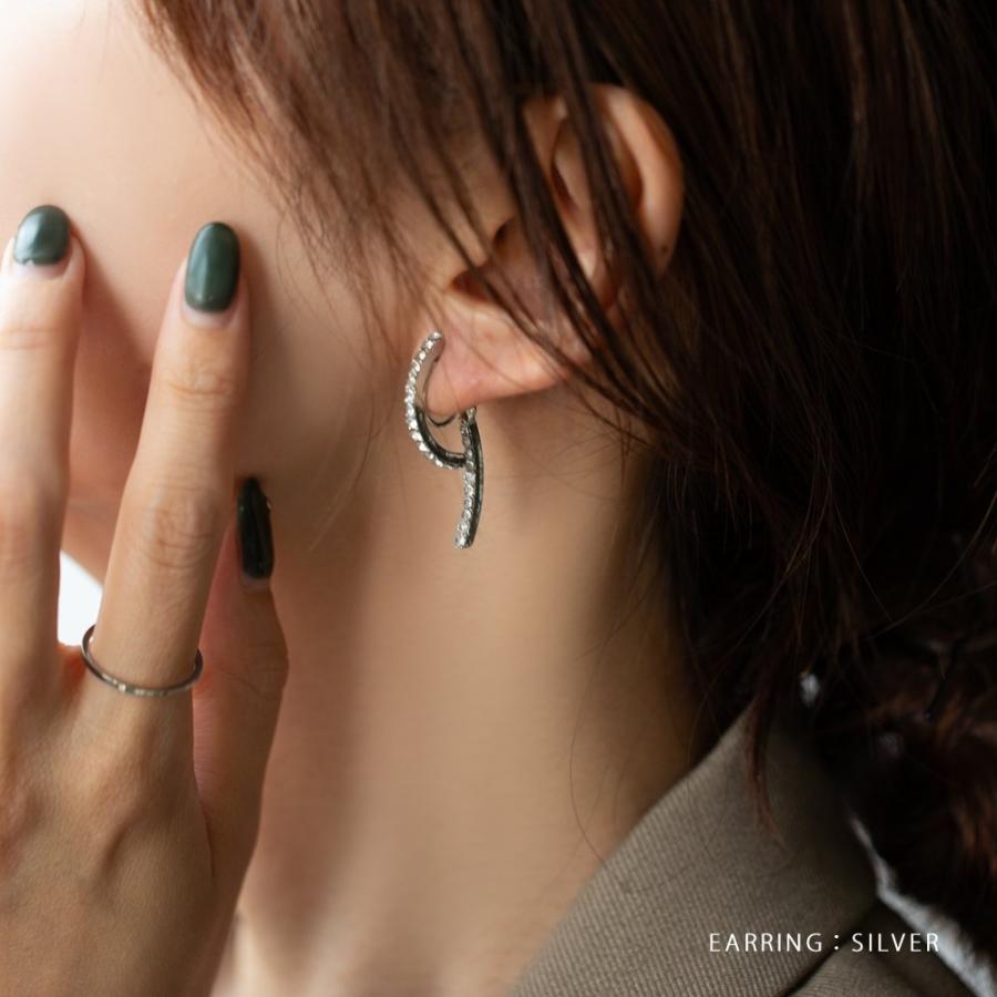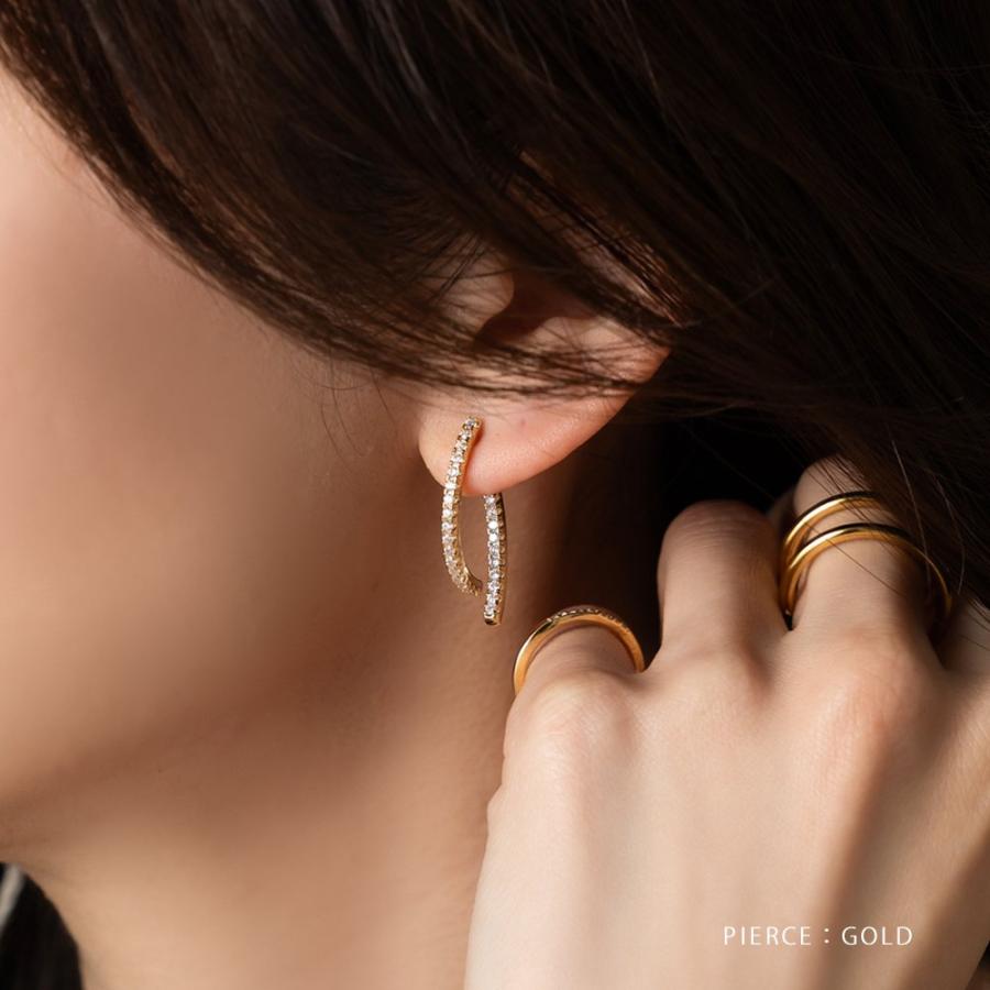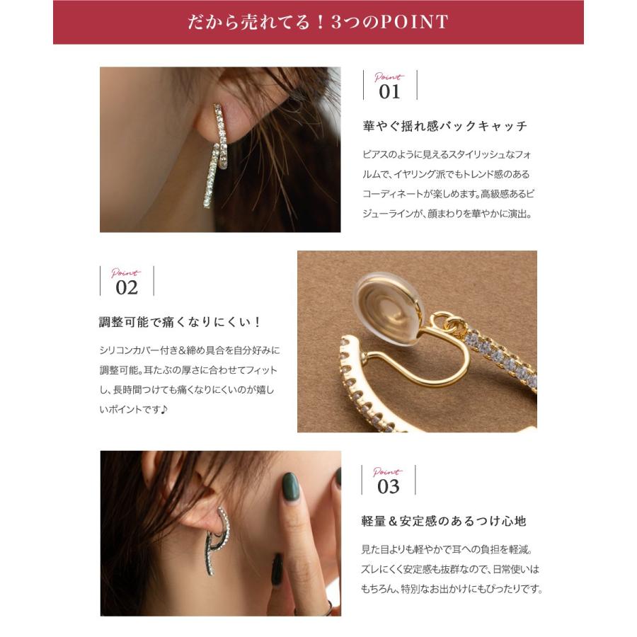 どの角度から見ても大人可愛いバックキャッチイヤリング/ピアス。ビジューラインがお顔周りを華やかに魅せ、グッとこなれた印象を演出します。イヤリングは落ちにくく軽い着け心地のシリコンパッド付きで、使いやすいのも嬉しいひと品。
