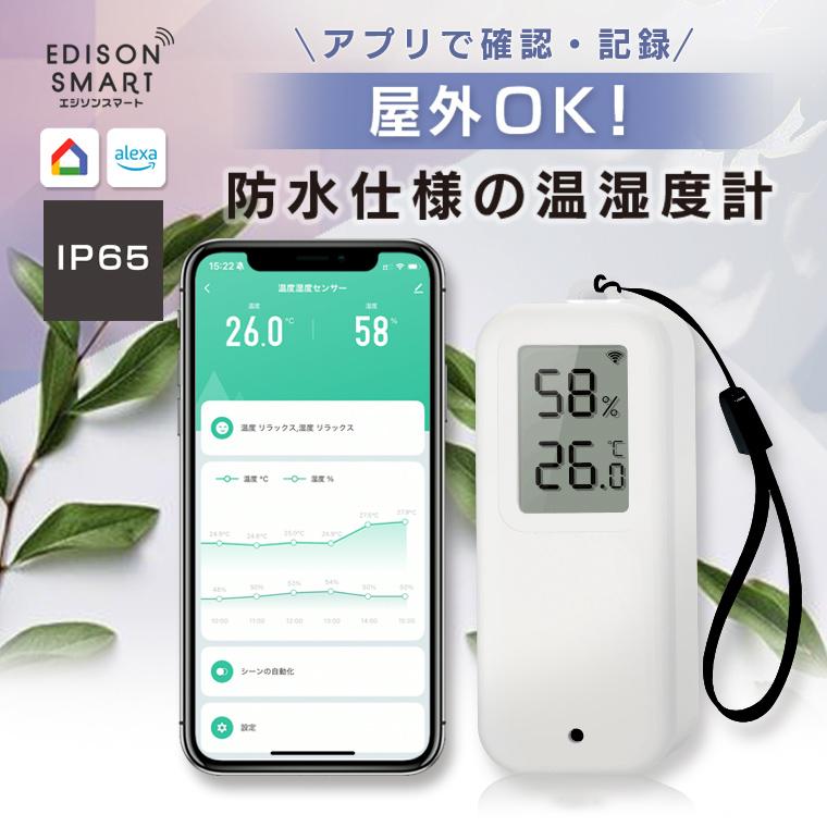 温湿度計 防水 IP65 防塵 屋外対応 小型 コンパクト 電池式 コードレス Wi-Fi接続 アプリで管理・記録 アラート通知 高精度 デジタル 温度計 湿度計 Alexa Google Home対応 エジソンスマート Edison Smart 温度湿度センサー ハブ不要