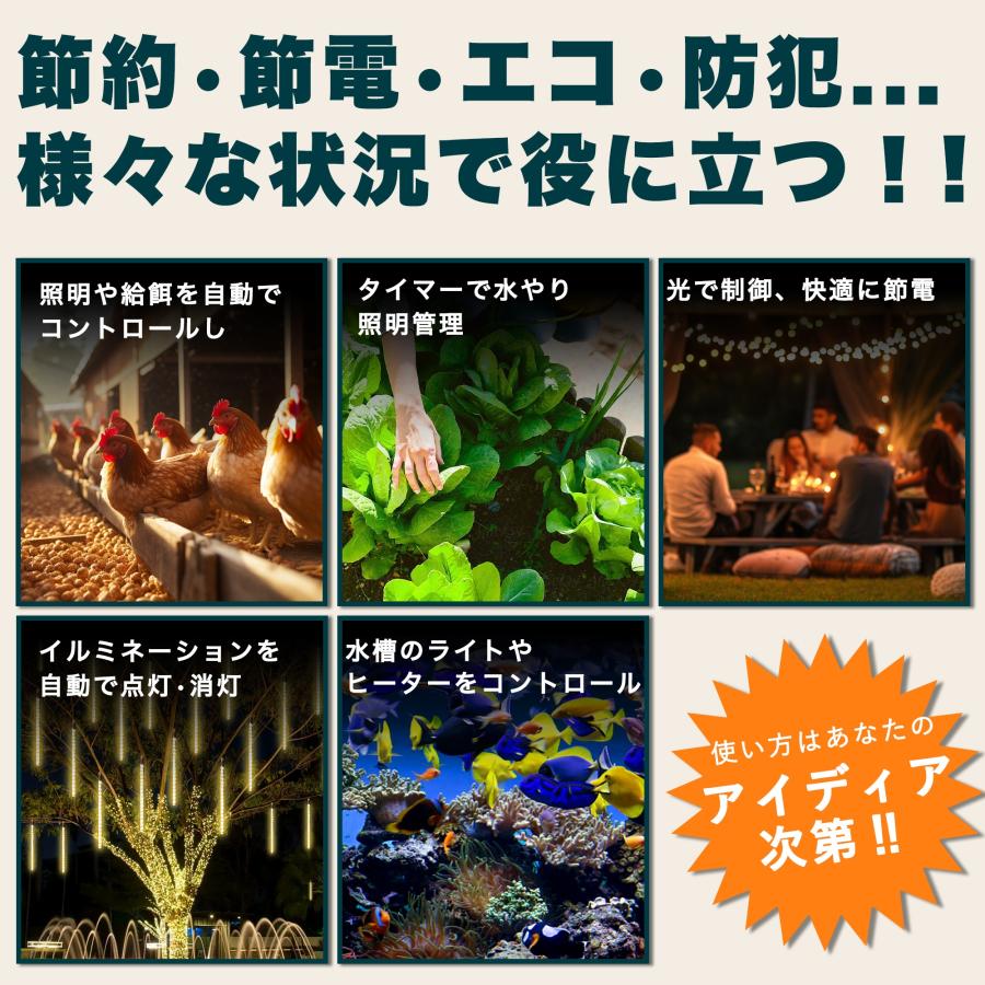 イルミネーションに、看板や街灯に、作業灯や投光器に照明器具とコンセントの間に接続するだけで、玄関灯、防犯灯、装飾灯ガーデンライト、作業灯などが、夜になると自動点燈し、朝になると自動的に消灯します。タイマー付きで消灯時間の設定もできます。