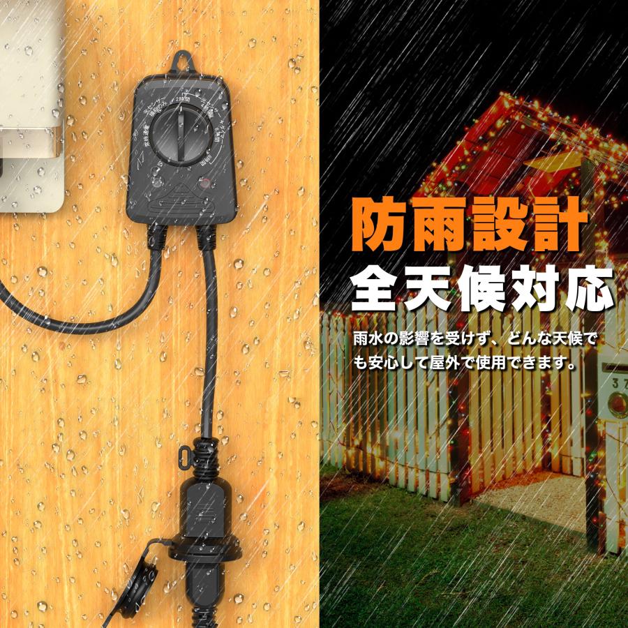 注意:接続するコンセントや照明器具のプラグが防雨型でないと防雨仕様にはなりません。完全防水ではありません。水中や水のたまる場所では使用しないでください。