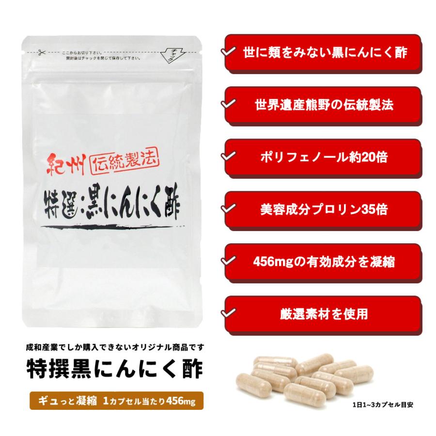 にんにくは国産のホワイト6片を発酵させた黒にんにくを使用。ポリフェノールは生にんにくの約20倍!コラーゲンの材料となるプロリンが黒酢の約35倍!アミノ酸のロイシン、バリン、アラニン、グリシン、グルタミン酸、アスパラギン酸も豊富に配合!黒酢と比べてDPPHラジカル消去活性が約6倍!一般的なカプセルに換算すると、約7カプセル前後に相当する量の黒にんにく酢粉末を凝縮!黒にんにく酢のパワーをふんだんに摂って頂こうと、ギッシリ詰め込みました。