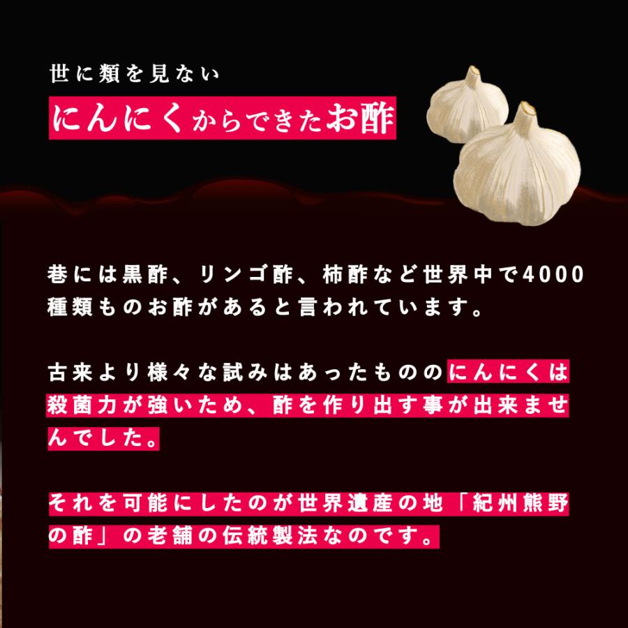 にんにくは殺菌力が強いため、酢を作り出す事が出来ませんでした。にんにくと黒酢を足したものでは無く、にんにくを酢に漬けたお酢でも無い、にんにくから絞り出したお酢は、お酢醸造の匠の経験と技術の賜物です。