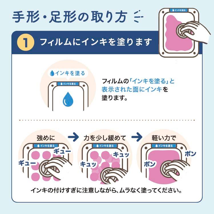 使い方は付属のフレームのフィルムにインクを塗り反対側から手や足を押し付けるだけ。<br>