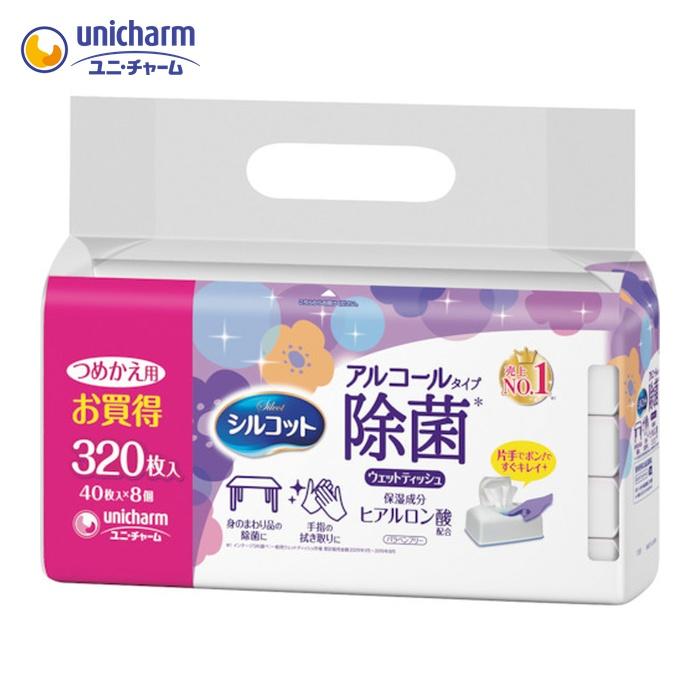 ◆ユニ・チャーム シルコット 除菌ウェットティッシュ アルコールタイプ 保湿成分ヒアルロン酸配合 詰替40枚×8パック(320枚)