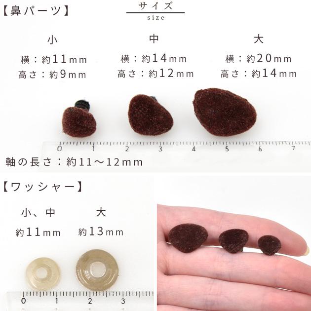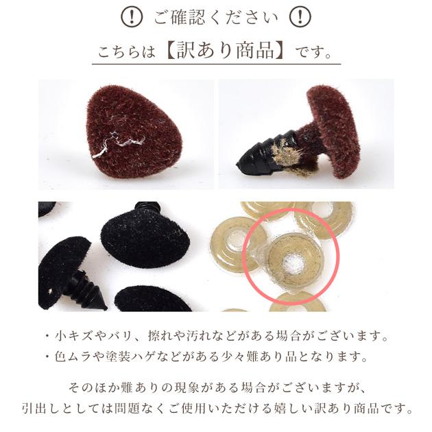 【訳あり】 ぬいぐるみ 鼻 パーツ 3サイズ 2色 8〜10個#ゆうパケ 小・中 75点可、大 50点可手触りの良いフロッキー素材の鼻パーツです。鼻パーツとワッシャーが入っています。パーツは全て差し込みタイプで、茶色と黒の2色、小・中・大の3サイズの6種類からお選びいただけます。小・中は10組、大は8組のセットです。お値打ち商品ですが、訳あり販売ですので、ご理解の上ご購入ください。(返品・交換対応対象外商品となります。)