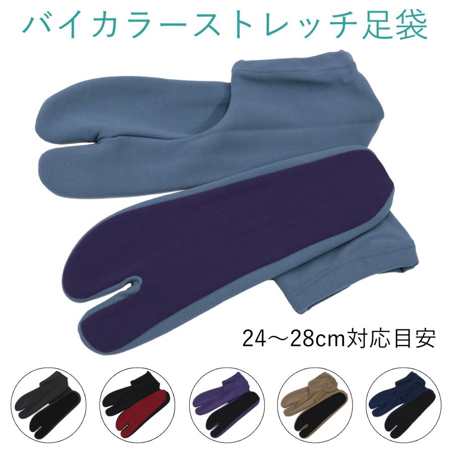 お洒落なカラーストレッチ足袋です。表面と底面が2色切り替えのバイカラーになっています。コハゼ(足首の留め具)の付いていない口ゴム式のソックスタイプになっているので靴下のようにスッと簡単に履くことができます。 伸縮性のあるストレッチ素材ですので、窮屈感も無く気軽な履き心地です。