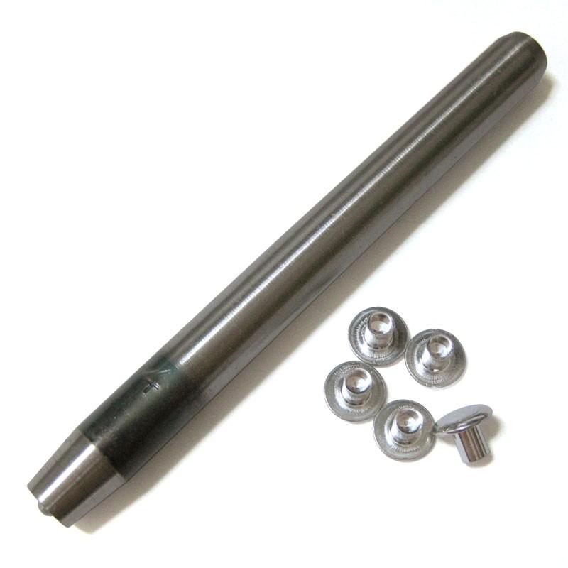 軸径4mmの中空リベットに使える手軽な手打ち工具と、金具をセットにしています。打つ時は必ず硬い水平な金属板の上で作業してください。 4mmの穴あけをお持ちでない方は、別途ハトメ抜き4mmをご検討ください。