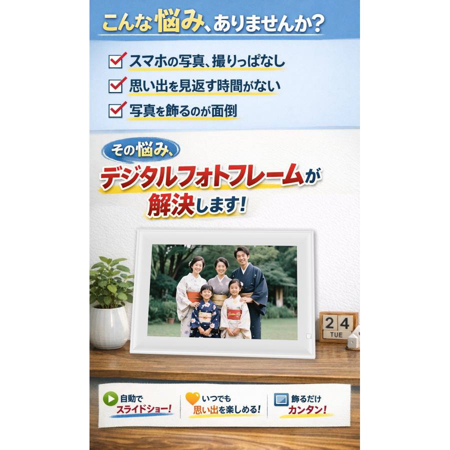 ブランド:moonka画面サイズ:10.1 インチカラー:ホワイト対応機種:iPhone / Android製品サイズ:18.5 x 26.4 x 2.5 cm解像度:1280*800 IPS内蔵メモリ:32GBセット内容:デジタルフォトフレーム本体×1、スタンド×1、電源アダプター×1、日本語取扱説明書×1写真 動画 音楽 ビデオ タッチパネル カレンダー 自動オンオフ プレゼント 結婚祝い 還暦祝い
