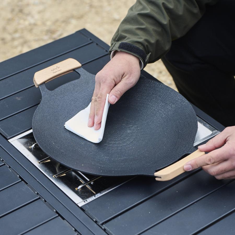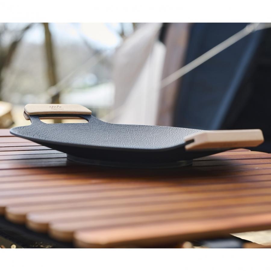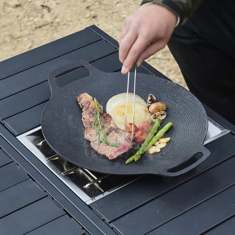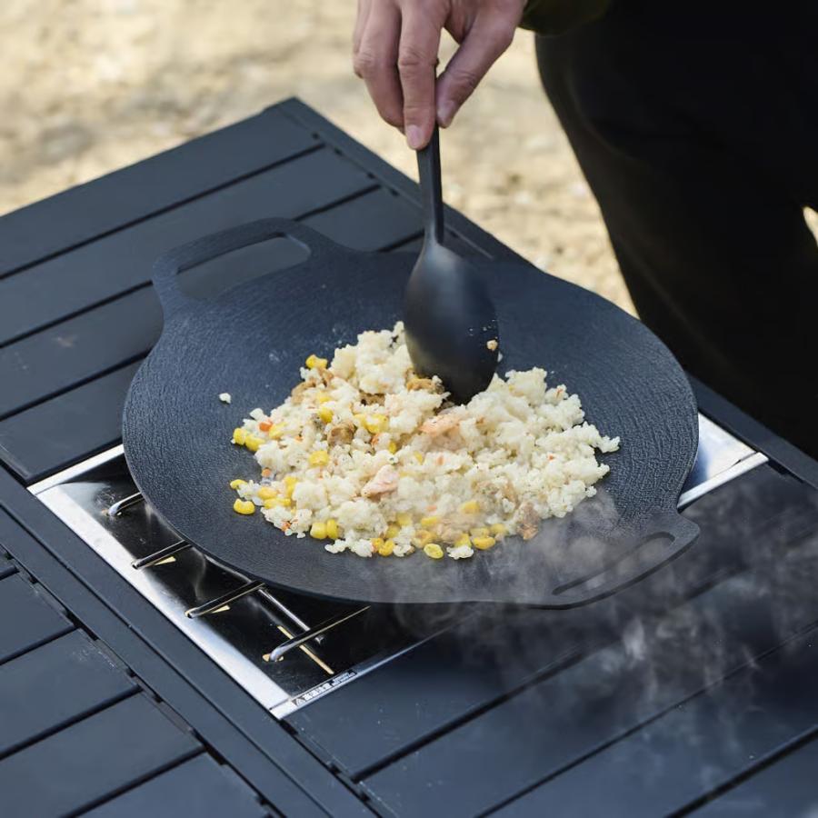 ◇油なしでも焦げにくい特殊加工で、キャンプの卓上をお手軽に華やかに彩る。