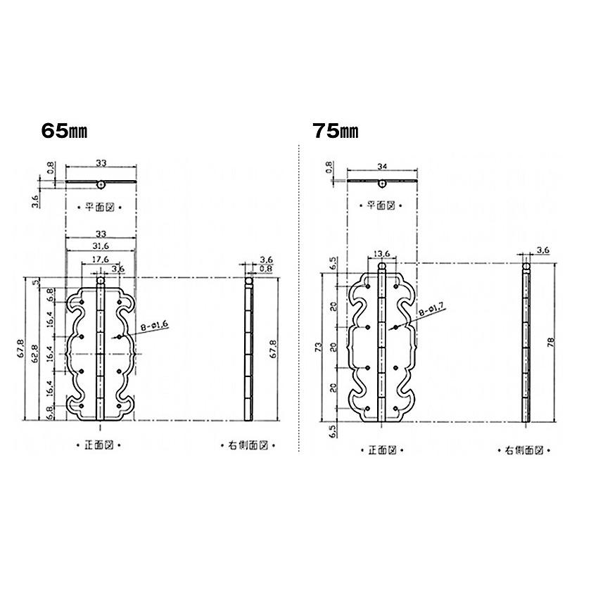 【※丁番類は全サイズ共通写真を使用している場合がございます。中にはサイズによってビス穴の数が異なる物もございますので予めご注意ください。】仏間・家具などの軽量扉に使われる飾丁番。装飾用の丁番の中でも定番のデザイン。シリーズカラーは3種類でサイズは2種類。用途に合わせて選んでください。【ご注意】釘は付属していません。