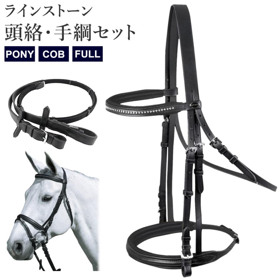 【送料無料】ラインストーン 頭絡・手綱セット WBRA3 | PONY/COB/FULL レザー 本革 本皮 牛革 水勒 頭絡 とうらく 額革 布手綱 ブラック 黒 サイズ ポニー コブ フル サラブレッド 馬 乗馬 乗馬用 乗馬用品 馬具