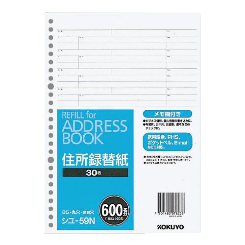 コクヨ アドレスブック替紙 B5タテ 600名収容 30枚 シユ-59N アドレスブック用ルーズリーフ ルーズリーフ ノート