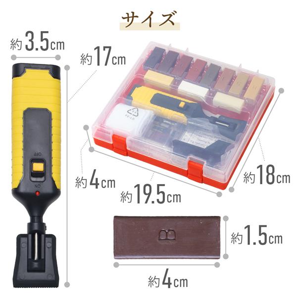 サイズ:幅18cm 横:19.5cm 縦4cm重量:350g※電池は別途ご用意ください。※日本語説明書は付属されておりません【注意事項】・使用中は電気ペンの温度が高くなる為、できるだけ接触を避けて下さい。・単三電池を使用します。別途ご用意ください。・小さいお子様の手に届かない場所で保管して下さい。キズ 傷 隠し 隠す 消す 家具補修マーカー 修理キット 木製品キズ補修 木製家具 ドア 修復 フローリング用 あらゆるキズの補修セット