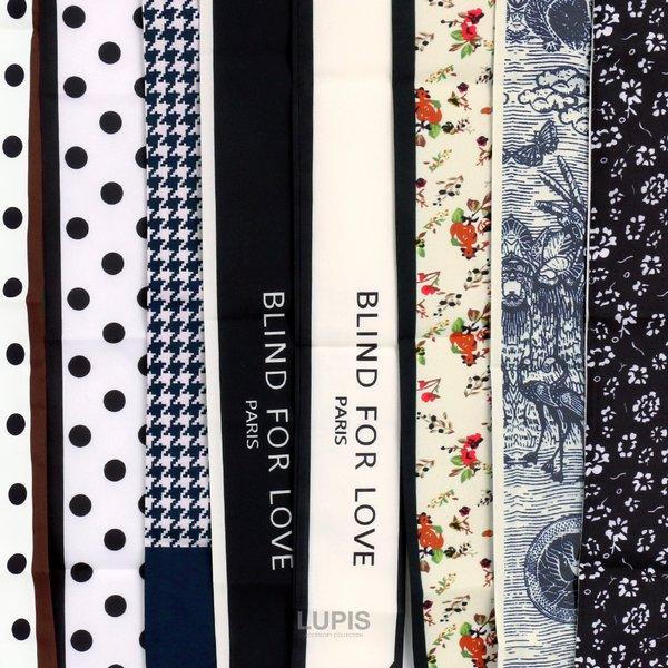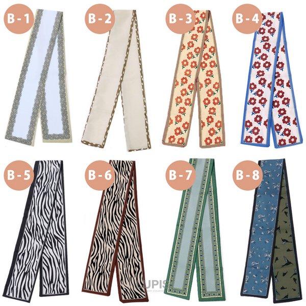 頭、首元、手首、腰、バッグ等、色んな用途で使える細長タイプのスカーフ。