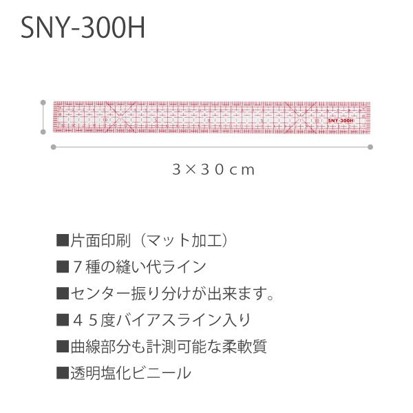 SNY方眼定規片面マット加工30cm SNY-300H品番:10438入数:1サイズ:30x3cm用途:製図用 定規JAN :45485031043832、3、5、7、8、10、13mmの縫い代ラインが豊富な定規です。45°のバイヤスラインが2か所あり。(端と中央)パッチワークや手芸に適しています。片面がマット加工されているので、製図用紙に接する面が滑りやすく、定規の移動がスムーズに動きます。同じシリーズで30cm、50cm、60cmの3種類あります。