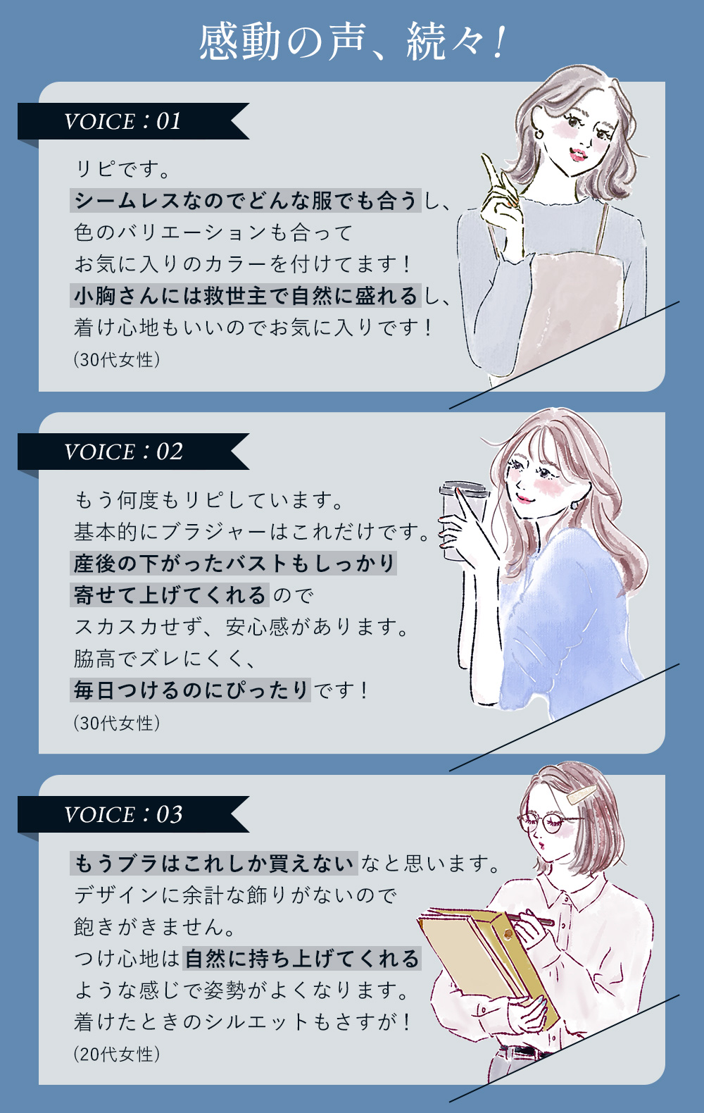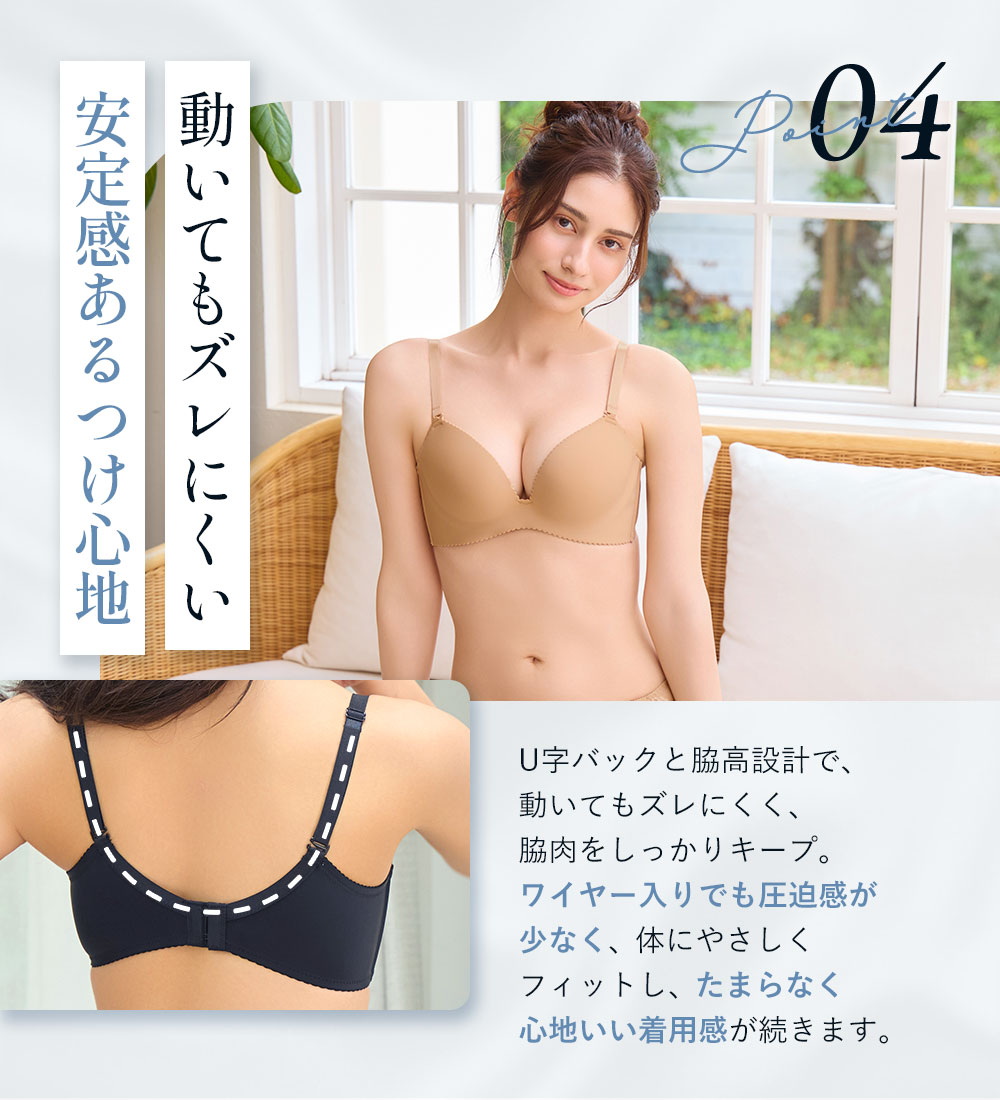 マットでスムーズな質感で、たまらなくさわり心地のいいシームレスブラ。縫い目がないのでピタTにも響きにくく実用的!脇高の形なので、脇から寄せた胸をしっかり固定してくれます。さらに、下厚カップなのでより一層ボリュームUPして、谷間をつくってくれる優れもの!定番のブラック・グレー系、ベージュ系といったベーシックカラーから、レッド・ピンク系、パープル・ブルー・ネイビー系、グリーン系、などシーズン毎の流行色も勢揃い。あなたの欲しい色がきっと見つかりますよ。