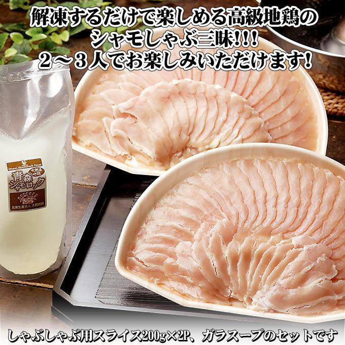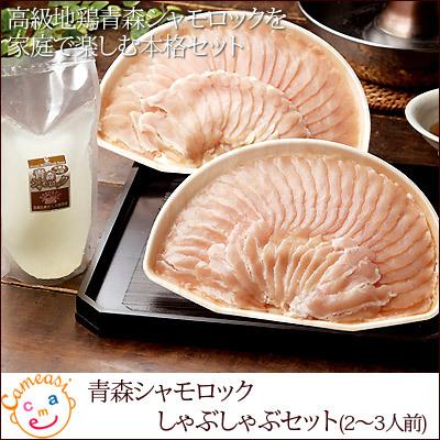 上品で深みのあるダシ!サクサクと臭みのない上質な肉質!宮内庁の御料牧場に出荷され晩さん会や園遊会など皇室関係の食卓を飾るまで品質に定評がある青森産高級地鶏「青森シャモロック」■賞味期限/フレッシュ-商品到着後冷蔵3日/冷凍-冷凍1ヶ月 青森県産青森シャモロックしゃぶしゃぶセット(2〜3人前)●しゃぶしゃぶ用スライス(ムネ肉)200g×2●ガラスープ400g
