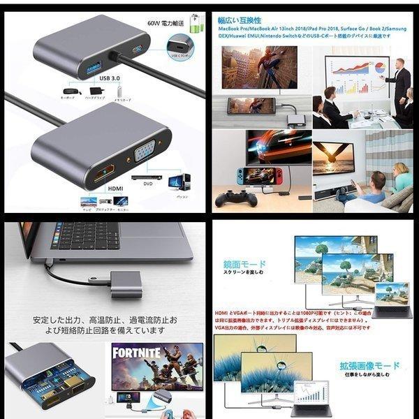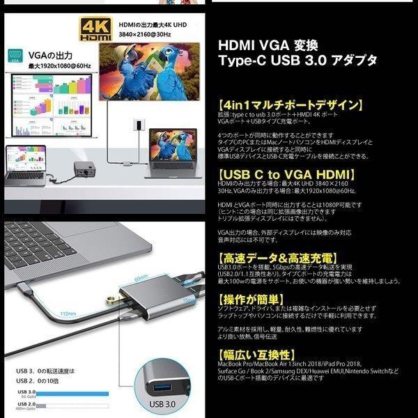 【4in1マルチポートデザイン】 拡張:type c to usb 3.0ポート+HMDI 4K ポート VGAポート+USBタイプC充電ポート。 4つのポートが同時に動作することができます タイプCのPCまたはMacノートパソコンをHDMIディスプレイと VGAディスプレイに接続すると同時に 標準USBデバイスとUSB-C充電ケーブルを接続ことができる。