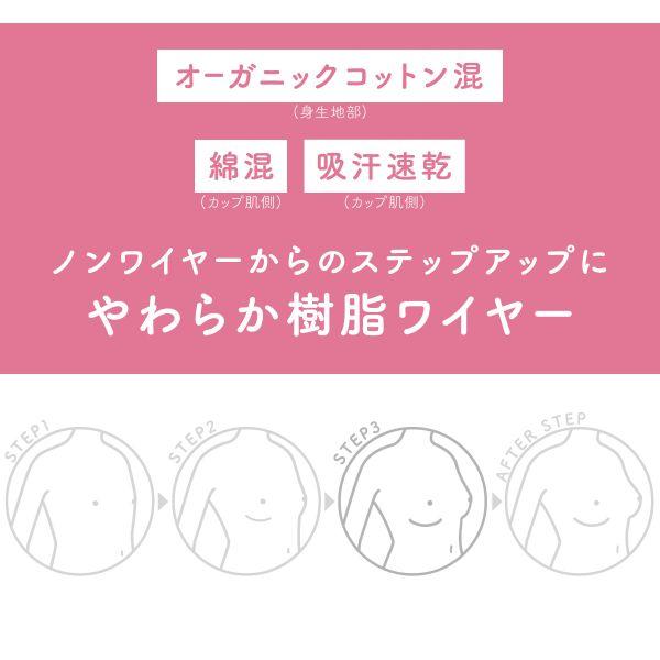 バストがだんだんまるみをおびてきて、そろそろワイヤーブラもつけてみたいな、と思ったら。ノンワイヤーからのステップアップにぴったりな、ソフトなつけごこちの樹脂ワイヤータイプです。