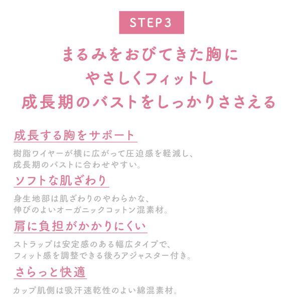 まるみをおびてきた胸にやさしくフィットし、成長期のバストをしっかりささえるSTEP3、3/4カップブラジャー。