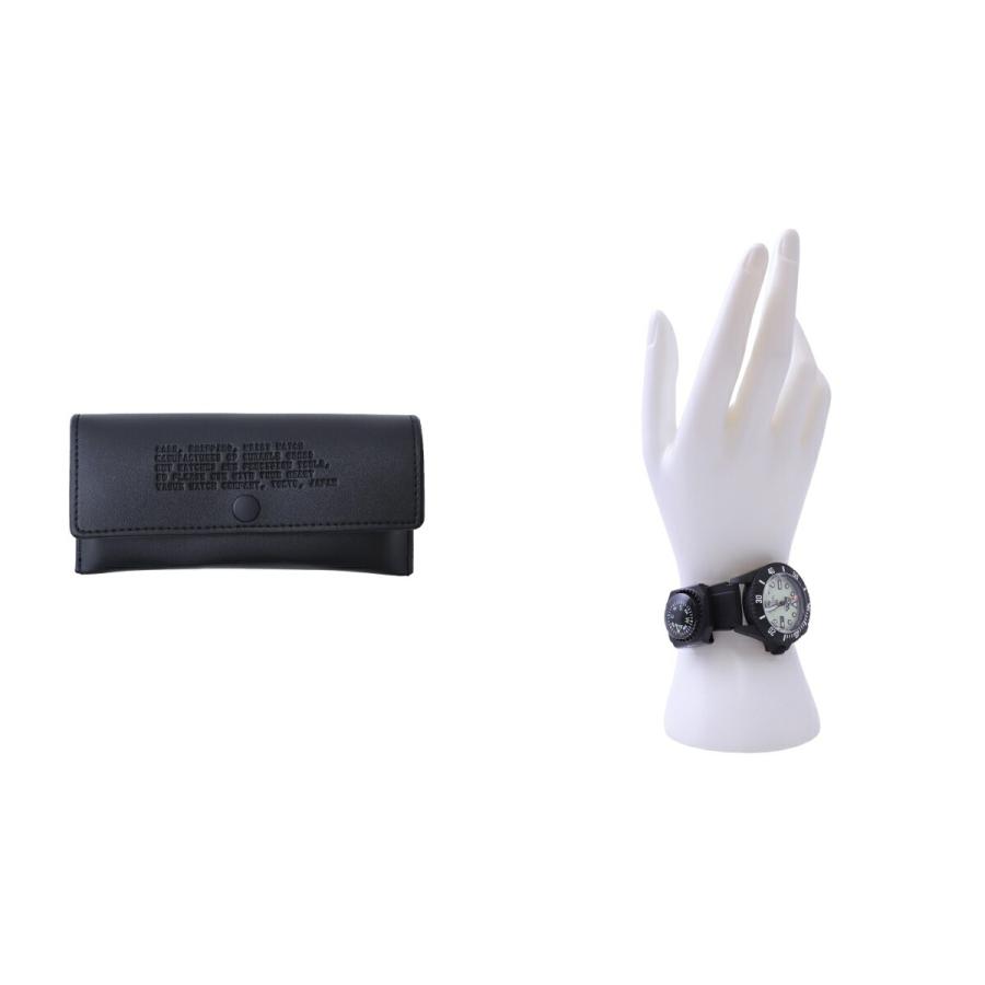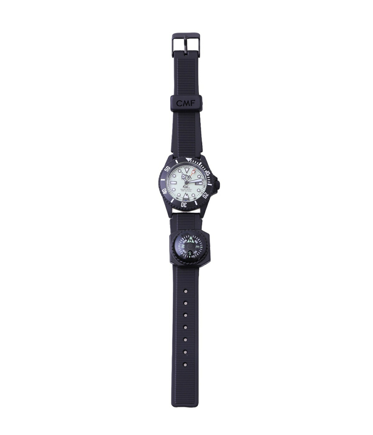 VAGUE WATCH Co.×CMFの初コラボによるボーイズサイズのフィールドウォッチ。80?90年代のミリタリー由来の雰囲気を踏襲しつつ、薄型ウレタンベルトと米メーカー別注のフィールドコンパスを備えた機能的デザイン。文字盤は暗所で光るライトグリーンの蓄光仕様、ケースはIPブラックメッキでタフかつ上質。12時側の立体CMFロゴや、山を想起させる6時の三角インデックスなど独自の意匠が随所に光る。小ぶりで軽快な着け心地のためデイリーからアウトドアまで幅広く活躍。フェイス縦4.3cm・横3.6cmの取り回しやすいサイズ感。