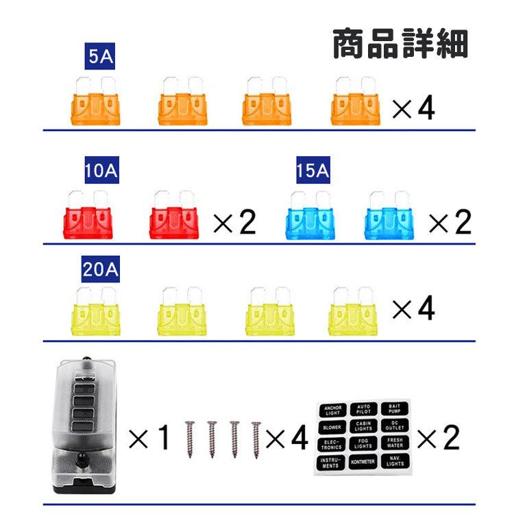 セット内容:ヒューズボックス、20Aヒューズ、15Aヒューズ、10Aヒューズ、 5Aヒューズ、シール、ネジ