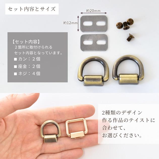 #ゆうパケ72点可バッグの仕上がりに美しいこだわりを・・・繊細で贅沢なデザインに!手カン 2個入/全3色バッグやポーチを一際美しくスタイリッシュに仕上げるパーツ。シンプルな定番の形はバッグ自体のデザインの邪魔はせず、完成度をグッと高めます。留具をネジで留め、カンの角度が変えられるので、バニッシュバッグなどフタが上についた形状の持ち手の取り付け、トートバッグのサイドにショルダーストラップ用に取り付けて2Way仕様にしたり・・・バッグ作りの幅が広がります。