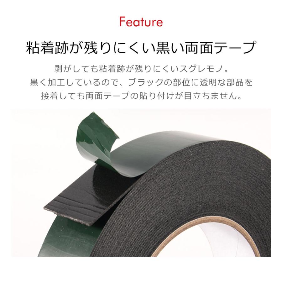 剥がしても粘着跡は残りにくい両面テープ。黒く加工しているので、ブラックの部位に透明な部品を接着しても、両面テープの貼り付けが目立ちません。