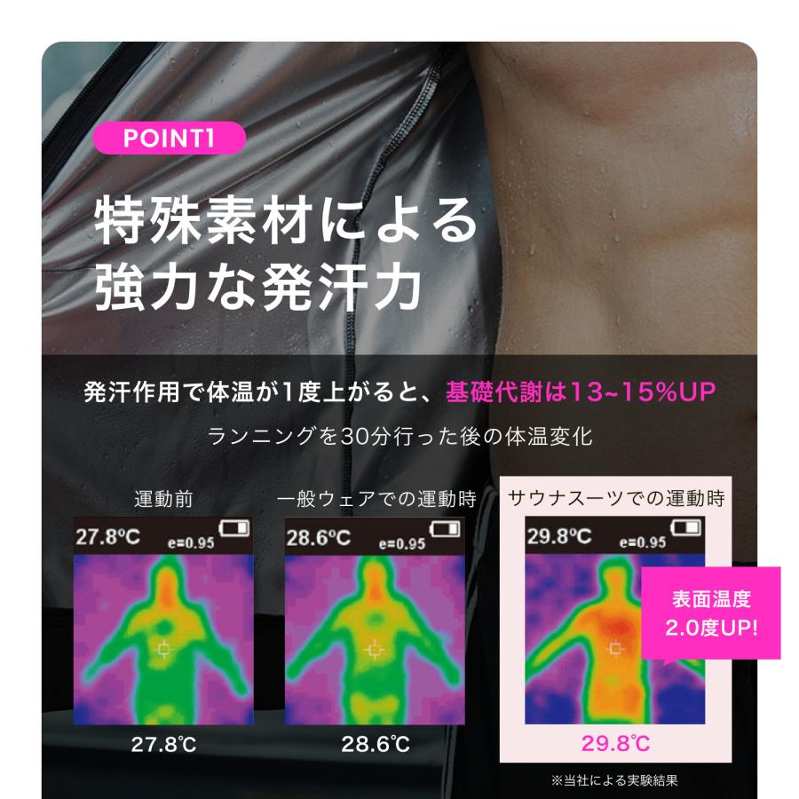 実験の結果、サウナスーツを着用して運動をした時の方がカロリー消費量がアップし、体重や体脂肪の減少に効果的なことが実証されました。