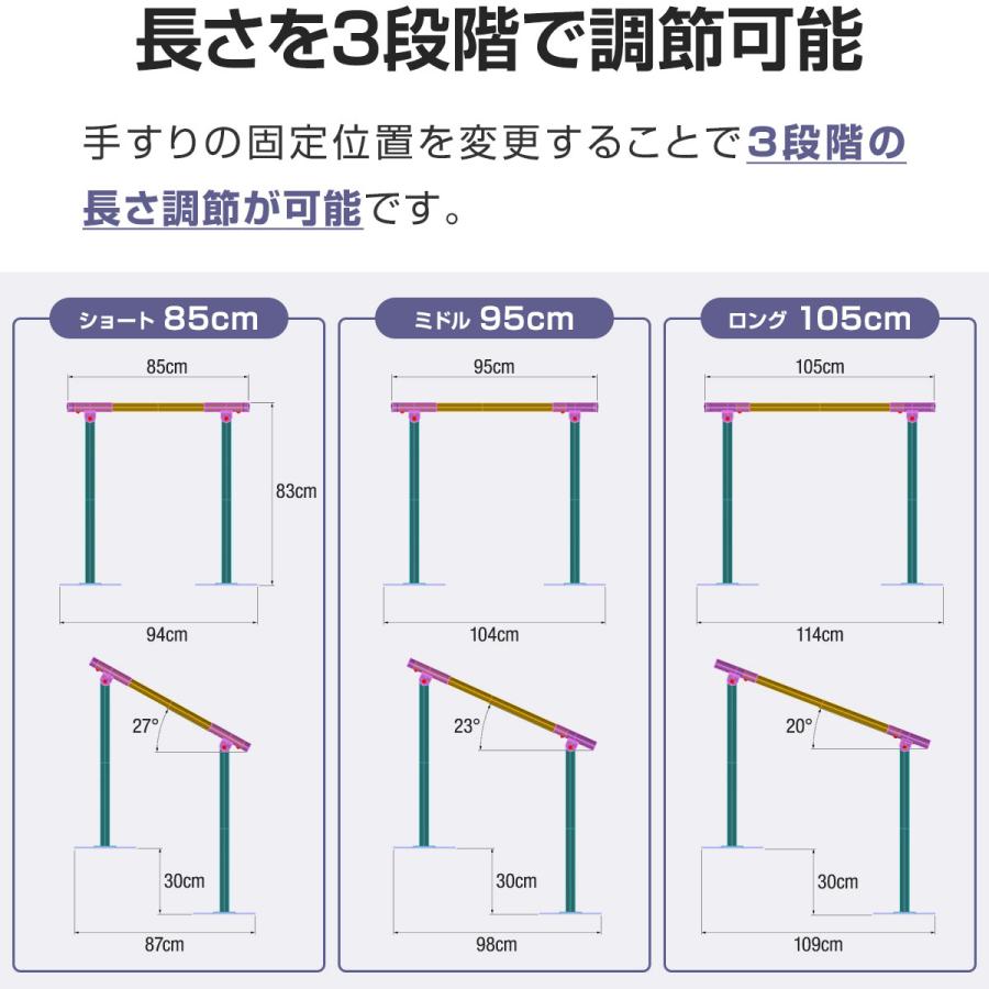 手すりの固定位置を変更することで3段階の長さ調節が可能です。段差に設置する際は長くするほど、手すりの角度を緩やかにすることができます。