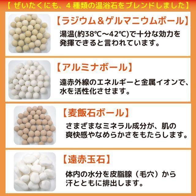 自宅で手軽に簡単ゲルマニウム岩盤浴!ぜいたくに4種の温浴石を使用しました!体を温めて汗を出す・・・身も心も爽快!快汗!疲れに!肩こりに!冷え性に!むくみに!肩にかけて入浴するだけ・・・体の芯からポッカポカ〜!そのままお風呂の底に置いても・・・じんわり温ったまる〜!膝にのせてもOKですよ!体の深部を温め、深部からの発汗作用により、健康、美容、癒し効果を!自宅にいながら手軽に最高のリラックスタイムを!入浴剤よりも経済的です!★もっと詳しく&お得な2個組もご用意★ ↓ ↓ ↓ ↓