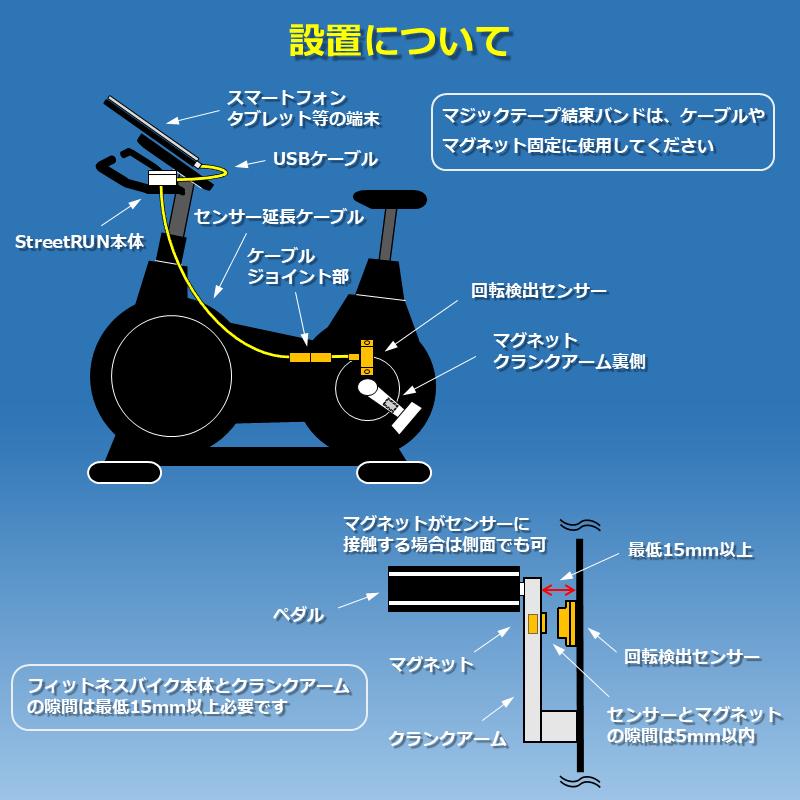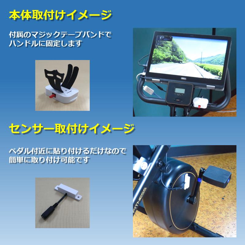 フィットネスバイク、エアロバイク、スピンバイク等、センサーさえ取り付ければ、特定のアプリに依存することなく、ストリートビューと連動させることが可能です。