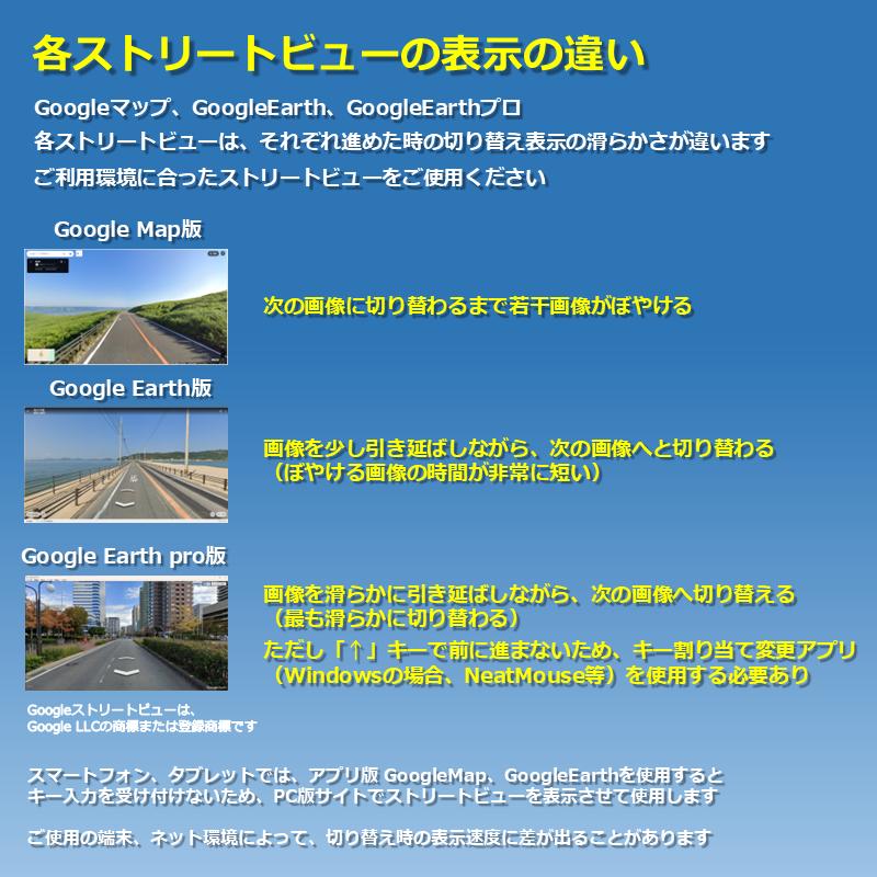 PCで使用する場合、Google MAP(パソコン版)からストリートビューを表示するより、Google Earth(ウェブ用)からストリートビューを表示させたほうが、よりスムーズに画面が切り替わります。